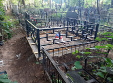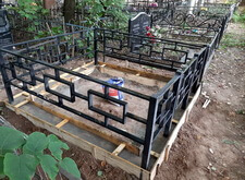 Клиент заказал у нас комплексное оформление места захоронения, в которое входят: классический горизонтальный памятник из чёрного гранита с прямоугольным цветником, простая металлическая оградка, а также наземное покрытие места захоронения гранитной брусчаткой. В первый наш приезд на кладбище могила выглядела следующим образом: два деревянных крестика и простое ограждение.