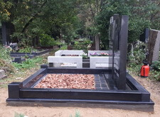 Возвращаем надгробья на место, укрепив подставку двумя рядами брусчатки. По периметру участка ставим гранитный цоколь, в качестве наземного покрытия остальной территории используем кору.