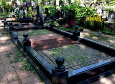 На данном месте захоронения мы ежемесячно проводим уборку: клиент желает поддерживать могилу в постоянной чистоте. Так как порядок на участке наводится регулярно, то и работы здесь не особо много: почистить брусчатку, сквозь которую кое-где прорастает мелкая травка, а также вытереть от пыли ограждение и памятник.