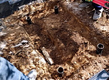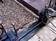 Далее приступаем к установке подставки памятника. После того, как она была возвращена на своё место, размечаем цветник. Параллельно работаем с периметром могилы: по краю пускаем металлическую планку, которая послужит границей брусчатки.