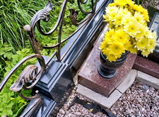 Наступает завершающий этап работы. Укладываем брусчатку (кроме декоративной функции, она служит дополнительной опорой цветнику. Если бы её на участке не было – нам бы пришлось залить периметр обычным бетоном, что смотрелось бы достаточно непрезентабельно), параллельно зачищаем лавочку и собираем на место памятник.
