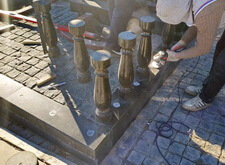 Начинается процесс монтажа. Доставляем памятники, крепим их, приклеиваем и насаживаем на штыри все конструктивные элементы надгробий.